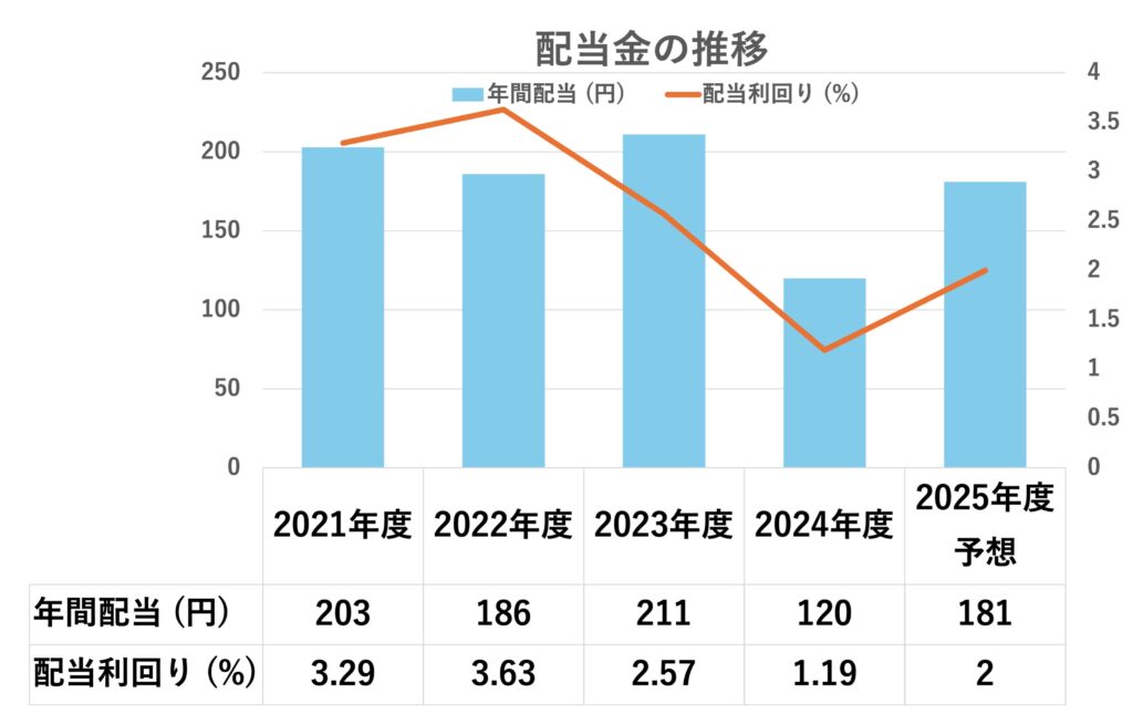 2025年度の1株あたりの年間配当金予想は181円、予想配当利回りは約2%。