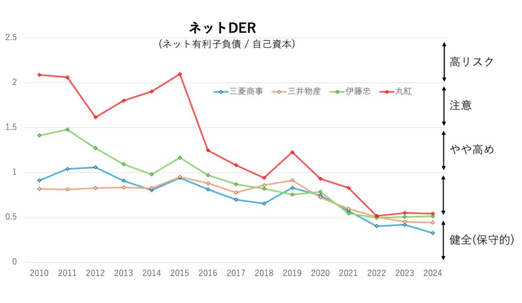 どの商社も財務安定性は増しており、借金を使ったレバレッジは低くなっています。