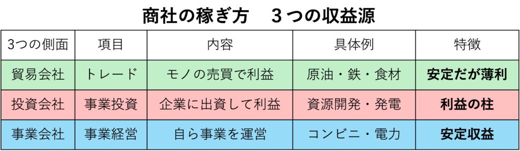 総合商社はこの「貿易会社」「投資会社」「事業会社」3つの側面を持ち、それぞれでトレード・事業投資・事業運営を行うことで利益を生み出しています。