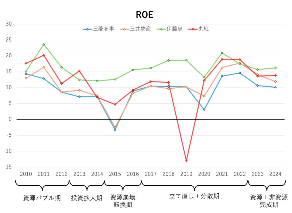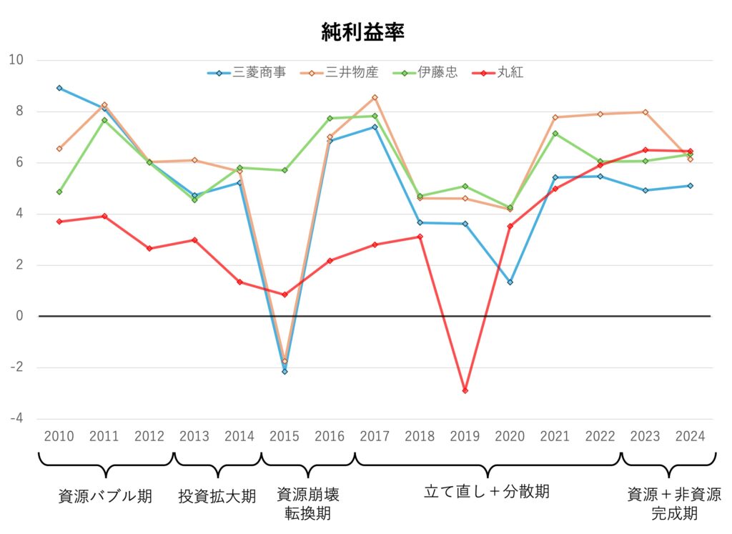 伊藤忠は非資源中心の収益でボラティリティ低め。他と比べると純利益率もROEも小さい変動で経過しています。