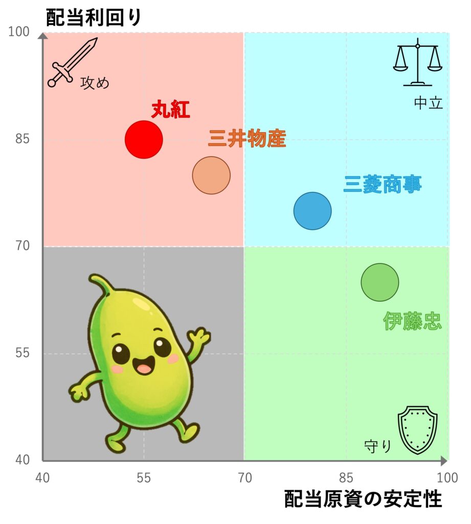 今回は配当利回りと配当原資の安定性をそれぞれ100豆満点で採点し相対比較してみました。(豆=小豆独自の投資スコアです)