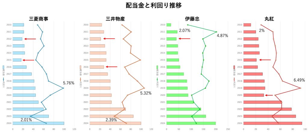 伊藤忠以外は丸紅も含めて累進配当宣言をしており、実際ここ数年は増配傾向が続いている商社ですが、