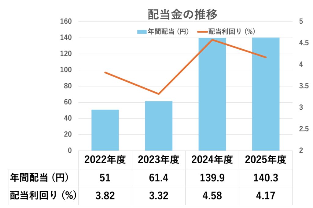2025年度の予想配当利回りは1株あたり140円。