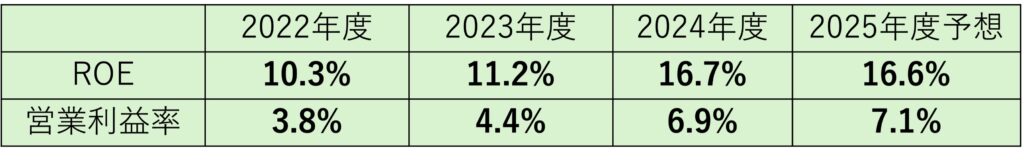 2025年度予想ROEは16.6%、営業利益率は7.1%。