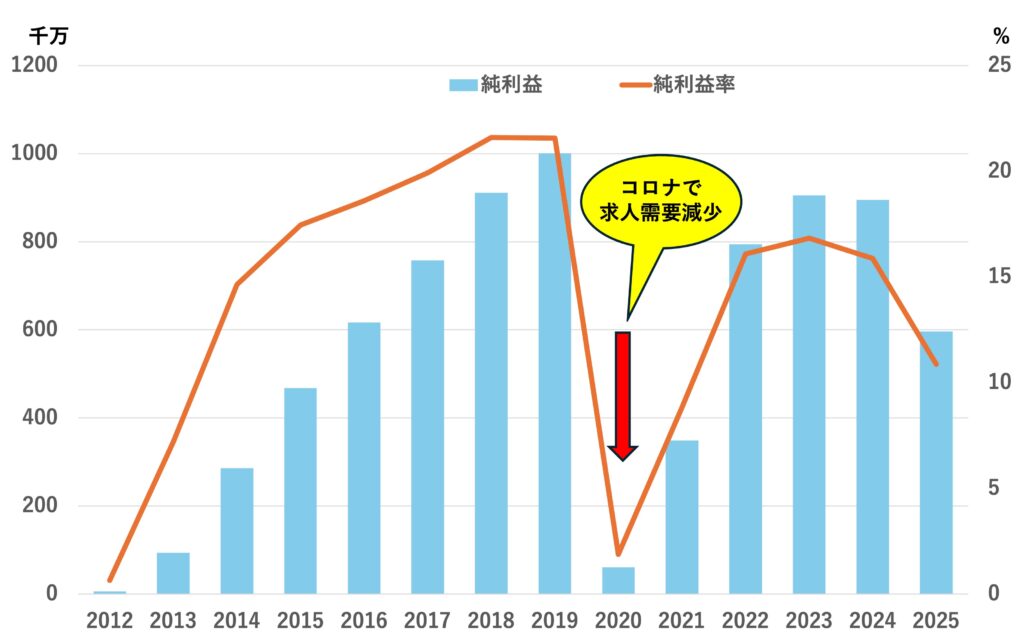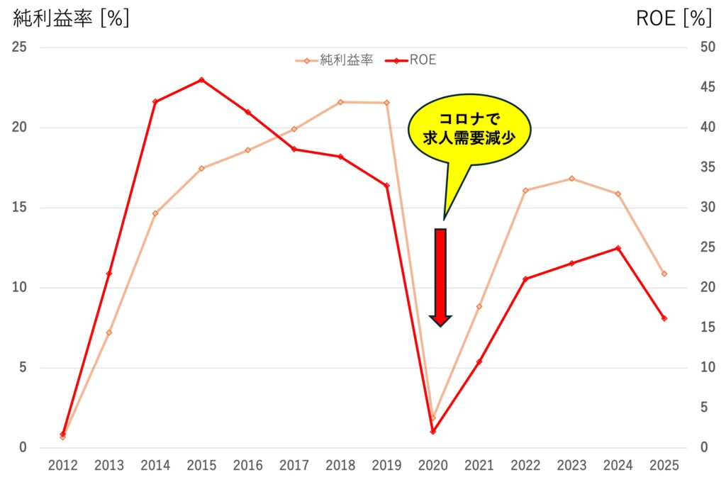 コロナの影響で求人需要の低下に伴い大きく減益しており、景気に強く連動する部分がここに見えます。