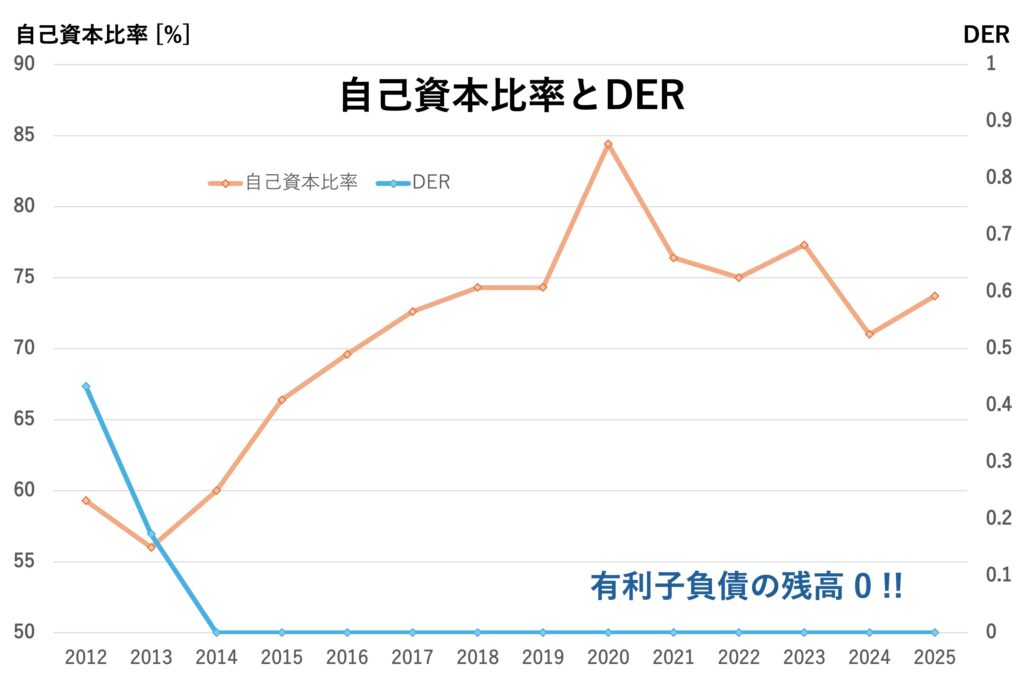 有利子負債はなんと、10年以上継続して0!そのためDERも0となっています。