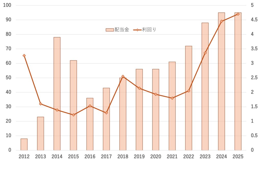 前期配当額を下限とする累進配当であり、利回りも4%後半と高く魅力的です。