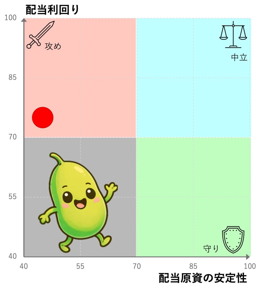 今回は配当利回りと配当原資の安定性をそれぞれ100豆満点で採点してみました。