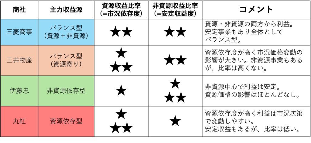 バランス型の三菱商事、資源寄りバランス型の三井物産、守りの伊藤忠、攻めの丸紅